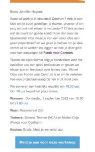 Tijdens de bijeenkomst krijg je handvatten voor het opstellen van een goed projectplan en geven we elkaar tips en feedback over ieders plan. Michel Odjo van Fonds voor Centrum is er om te vertellen hoe een projectaanvraag bij hen eruit moet zien.